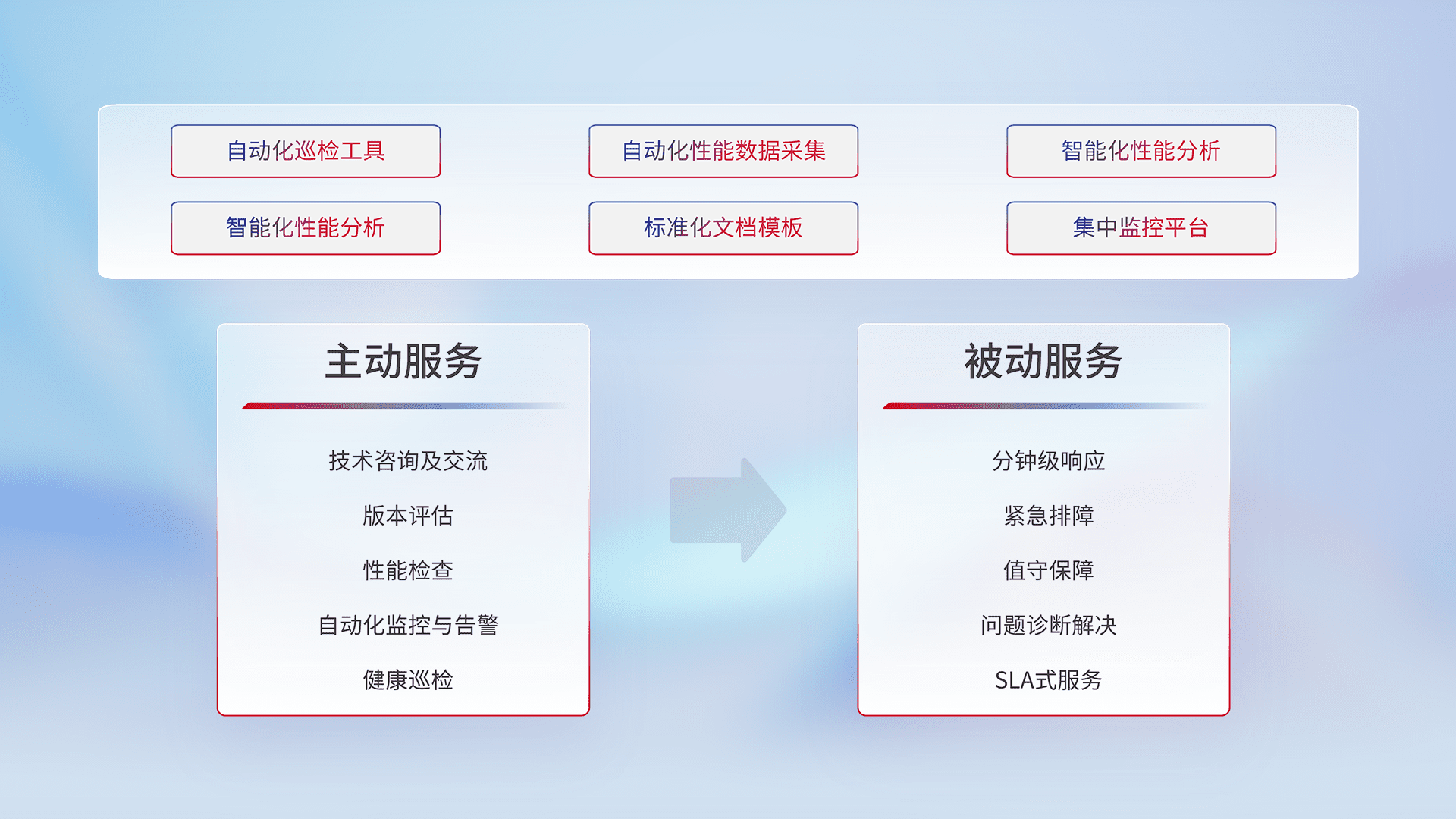 智能化工具和标准化文档,,,,保障服务质量,,提供主动服务(包含技术咨询、、、、版本评估、、性能检查、、自动化监控与告警、、、、健康巡检)和被动服务包含(分钟级响应、、、紧急排障、、值守保障、、、、问题诊断解决、、、SLA服务)。。。。