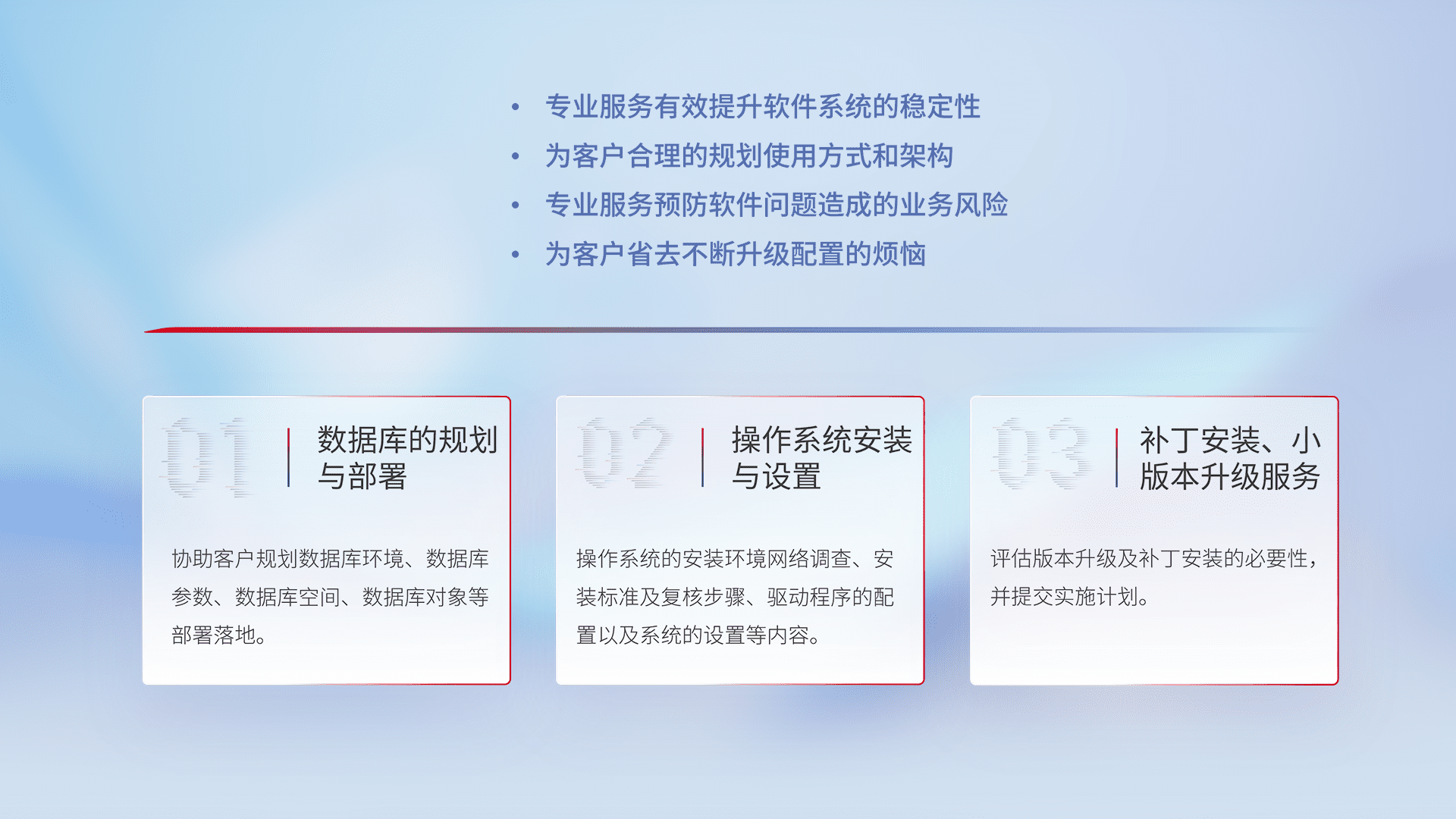 为客户提供软件规模升级、、快速部署、、按需配置的专业服务,,从数据库的规划与部署到操作系统的安装与设置,,再到补丁安装和小版本升级提供支持。。