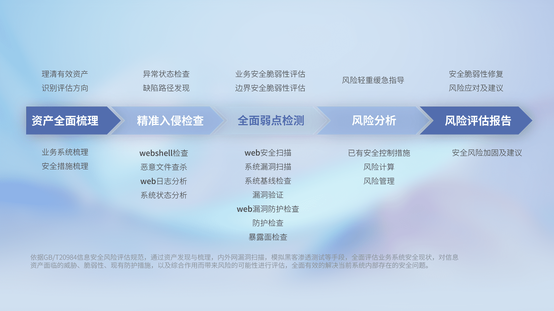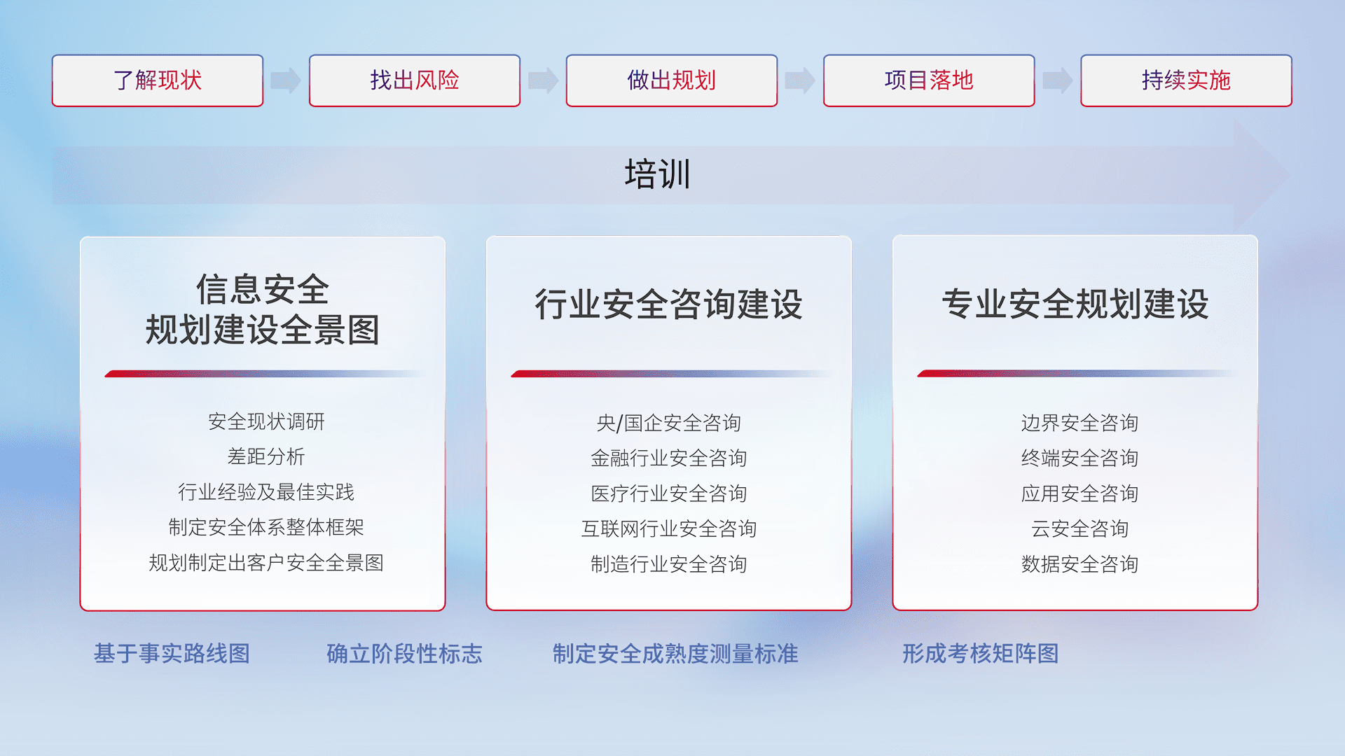 针对客户行业特性,,,,以专业的安全服务+多厂商联合解决方案提供专属的一站式安全管理服务,,,,帮助客户全面感知网络空间威胁,,基于识别、、、、检测、、、、分析、、、、防护、、监测、、、响应的服务理论模型,,,,从方案咨询、、集成交付、、、评估验证、、优化加固、、、运维运营,,,,致力于为客户提供完整的闭环管理式安全服务。。。以实战经验为客户打造高抵御风险的安全体系,,帮助客户发现威胁、、、、对抗威胁、、处置威胁,,不断积累安全对抗能力,,,,持续保障数字化安全。。。。